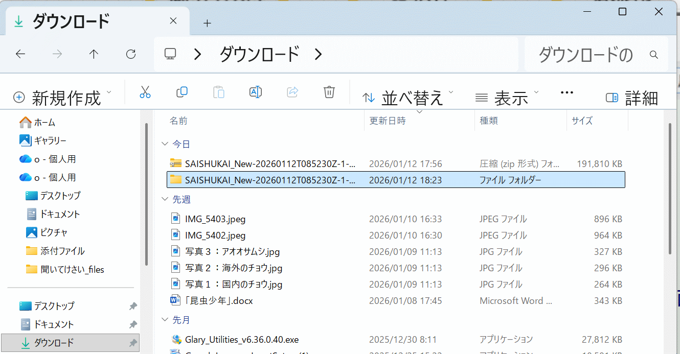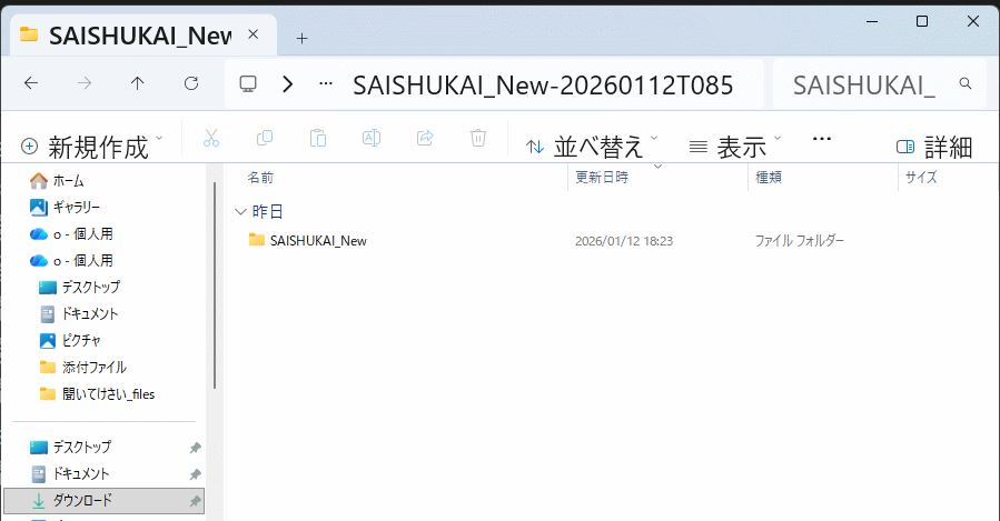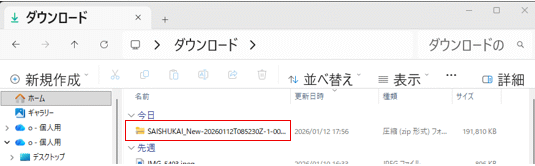 この「SAISHUKAI_New.....zip」ファイルを右クリック。表示されたメニューの「すべて展開」をクリック。下図が表示される
