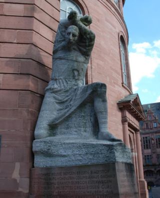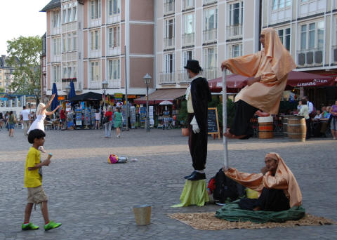 レーマー広場の大道芸 棒に手を掛け宙に浮いているように椅子に座っている男 その男を棒一本で持ち上げているようにみせるトリック 向こうには、若からぬ女性が白衣でバレーを踊っている