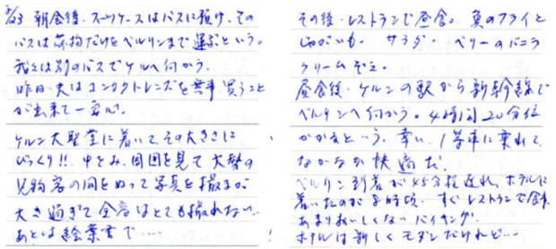 大聖堂すぐ近くのケルン駅から、ドイツ高速鉄道ICEでベルリンへ。座席は、一列と2列の座席が通路を挟む形で、我が新幹線の普通席よりもゆったりしている。案内には2等と書いてあったが、1等座席だったのだろうか。