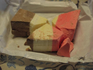 兎も角冷たくないし、アイスクリームの粘りはない。かりっかりっとかみ砕いて食す。どう贔屓目に見てもアイスクリームという食感ではない。かみさんの曰く「マシュマロをらくがんのように固めた感じね」。バニラ、チョコレート、イチゴと3層になっているが、要するに香りだけ。知らずに食べたら、アイスクリームを想像することはまずないだろう。