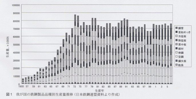 品種別に図をもう少し詳しく見ると,1980年代初期までは製品の主役は厚中板,棒鋼,型鋼などいかにも鉄らしい製品であったが,その後,熱延板・冷延板・亜鉛めっきという薄物に置き換わっており,なかでも亜鉛めっき鋼板の伸びが著しく,ここ数年ついにトップの座(17%)に着いた.