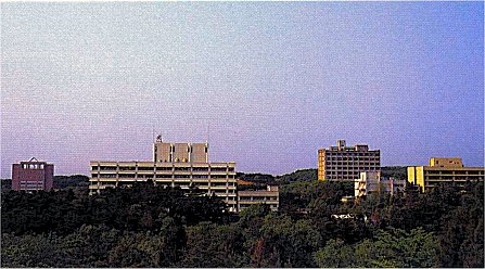 工学部遠景。 右端が化学系で、その左の白い建物は生物工学系(西野研、野沢研、熊谷研等)の研究室のために新設された。 その奥に見えるのは土木建築系の建物。 中央部手前が電気系でその奥に見える低い建物が管理棟。ここに旧応用理学教室系(いまの板谷、井上、黒川研究室)が入っている。 左端の建物は青葉記念会館。 |