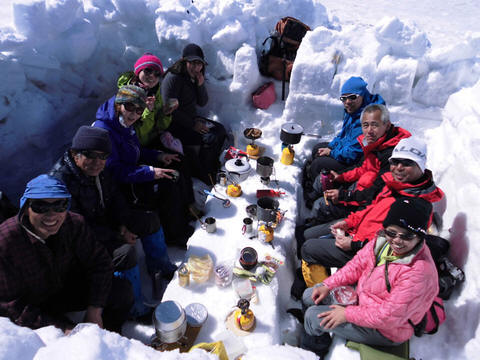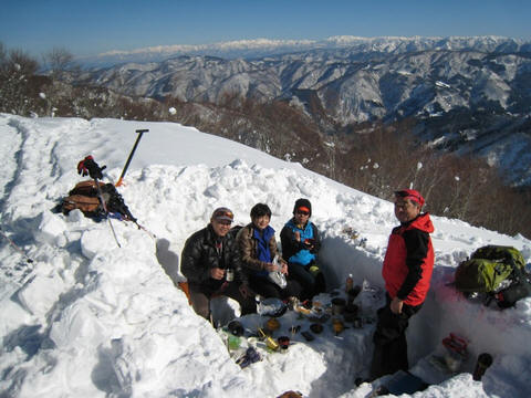 少し風があったので、山頂で塹壕を掘って宴会です。