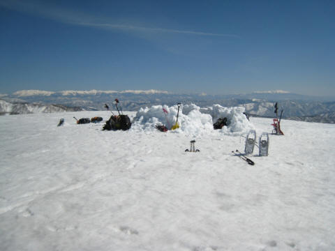 この日は風が強く、山頂で本格的に塹壕を掘って------、遠い背景は北アルプスです。