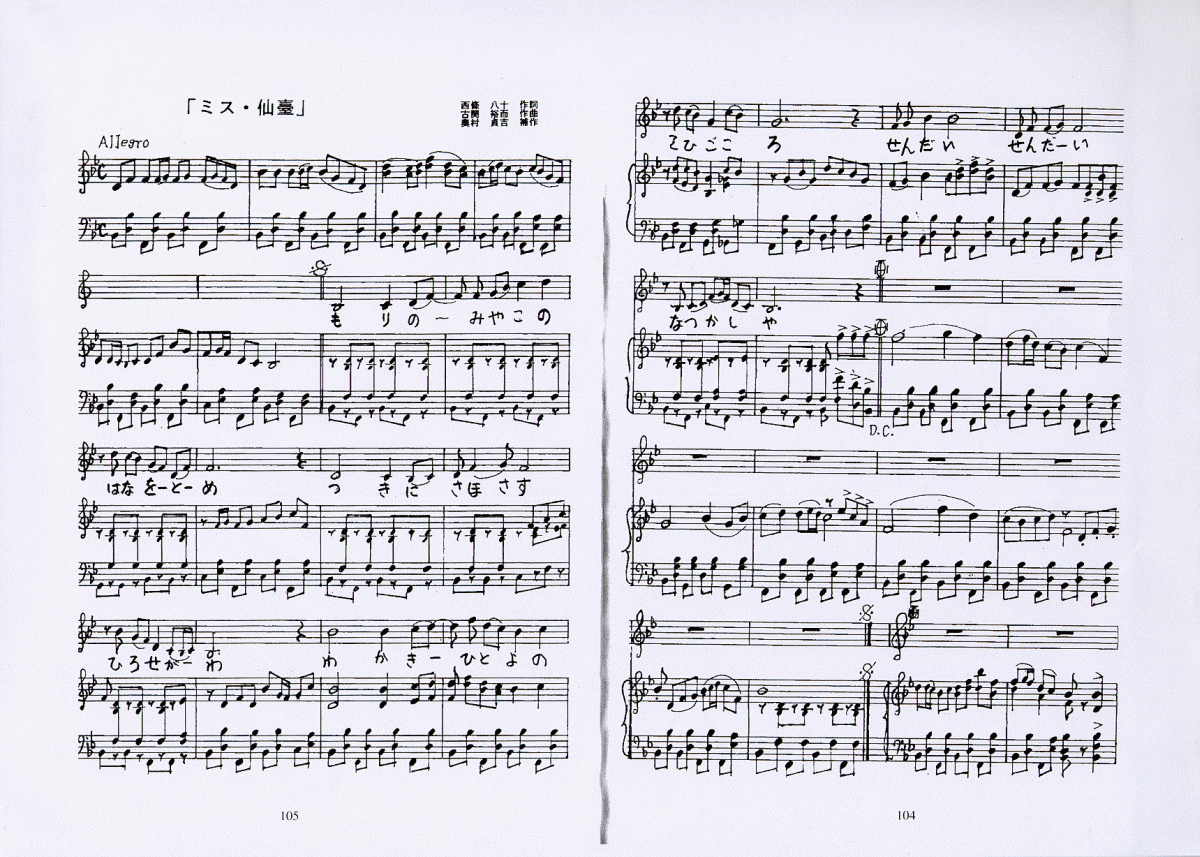 過日の三水会において堀尾君から、この歌の歌詞や背景等が詳述されている本:石澤友隆著「流行歌『ミス・仙台』〜郷土・仙台の近現代史散歩〜」(河北新報出版センター)が紹介された。席上、皆から、この歌詞・楽譜のコピーが欲しいとの要望があり、僭越ながら筆者がここに転載する次第です。