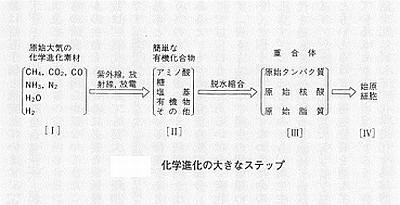 簡単な「分子」からなるアミノ酸などの、シンプルな「有機化合物」は、脱水縮合して原始タンパク質などの重合体となる。