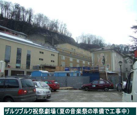 その町で毎年一大音楽祭が開かれる。ザルツブルク音楽祭である。バイロイトと並んで世界的に知名度が高い。一度は来てみたいがこれも将来の夢である。「これに来ないと死ぬに死ねない」と思っていると実現するかもしれない。 その音楽祭のメイン会場が「ザルツブルク祝祭劇場」である。今回は近くに行ったが夏の音楽祭に向けて外周りを工事中で全体はすっきりとは見えなかった。