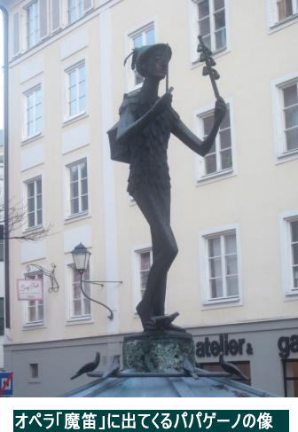 あの映画の中のモーツァルトは小柄でおっちょこちょいで大作曲家とはとても思えない人物像であった。一度頭に沁みこんだこの種の印象はななかな消えない。 少し離れて、パパゲーノの像があった。「魔笛」に出てくる”鳥刺し”である。こちらは何とも細身でしかもかわいらしい少年である。想像とは全く逆である。オペラでは、この役はよく恰幅のいいバリトン歌手が歌う。しかも女好きだし、いたずら好きだし、そういうイメージがあるので、違和感大であった。モーツァルトと同じである。