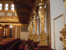 ホール全体の形は単純な長方形であるが、その両サイドの壁面に彫像(女神?)がずらりと並べられそれが金色に彩色されている。柱、手すり、天井等も基本的に金色である。しかしいわゆる金ぴかではなく、輝きを抑えた落ち着いた金色である。これが華やかさを際立たせている。