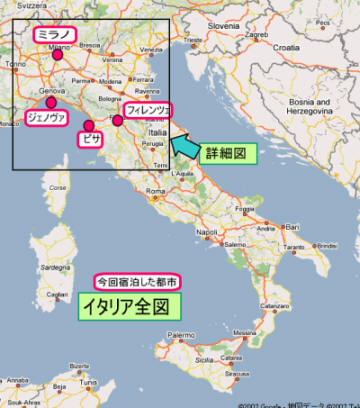 結局イタリアといっても地図で見る通り、北部のしかも西半分をところをチョコっと周ってきたというのが今回の旅の行程です。これでは「イタリア旅行」というわけにはいきませんです。それで「北イタリア・・・」ということにしました。本当のところは「北西イタリア・・・」なのですが。 北東と南の方(ヴェネツィア、ローマ、ナポリ・・・)は先のお楽しみということに。