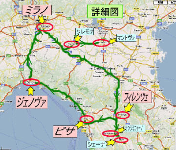 細かなところは上右の詳細図で見て下さい。赤丸が訪問した町、緑の線がツァーのルートです。
