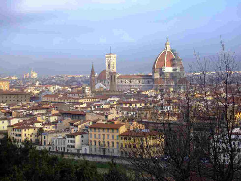 下の写真は郊外のミケランジェロの丘から見たフィレンツェの町ですが、中央にひときわ大きく見えるのがこの大聖堂です。写真で見るとおり、その存在感は他を圧倒しています。