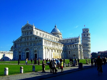 斜塔は、12世紀のまだピサが元気だったころに建てられたものです。行ってみるとわかりますが、この塔だけが独立してあるわけではなく、大きな教会の建物の一部です。フィレンツェのジョットの塔と同じで、鐘楼です。すぐ横には立派なドゥオモと洗礼堂があります。