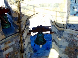 この塔が鐘楼であることの証明が右の写真です。下からはよく見えませんが、頂上には立派な鐘が吊り下げられています。