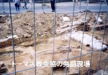 mall でしょうか。)の工事中に、教会の隣にあった墓地がアスファルト舗装の下に隠れていたのを見つけ出したようでした。他に、子供、大人各1体の遺骨がほとんど完全な形で掘り出されていました。道路の真ん中、4−5m×30−40m位の小さな面積ながら、ザクセン州による発掘が行われており、説明の掲示がありましたが、その場で読むのは、はじめからあきらめて、まず、HPのURL(http://www.archsax.sachsen.de/)を探し出し、メモしてきました。帰って、いざ読もうとしても、何年か読んでないドイツ語のこと、それに、老眼では、辞書をひくだけでも大変でした。興味のある方はどうぞ。